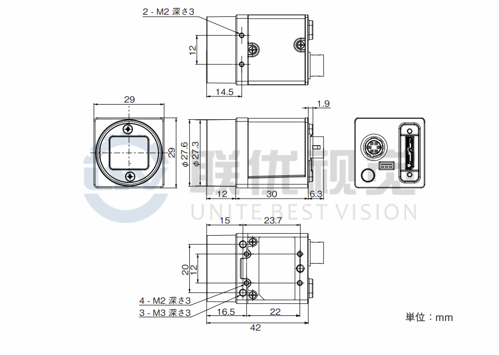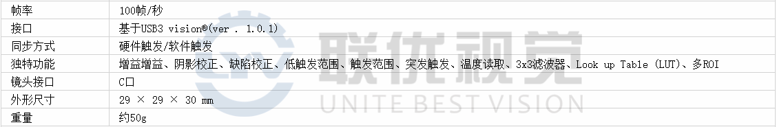 ●XCU-CG160(黑白)1/2.9英寸USB全局快門,160萬(wàn)像素,分辨率為1456 (H) x 1088 (V)(有效像素),幀速率超過(guò)100fps,支持USB3.0 Vision 1.0.1接口。