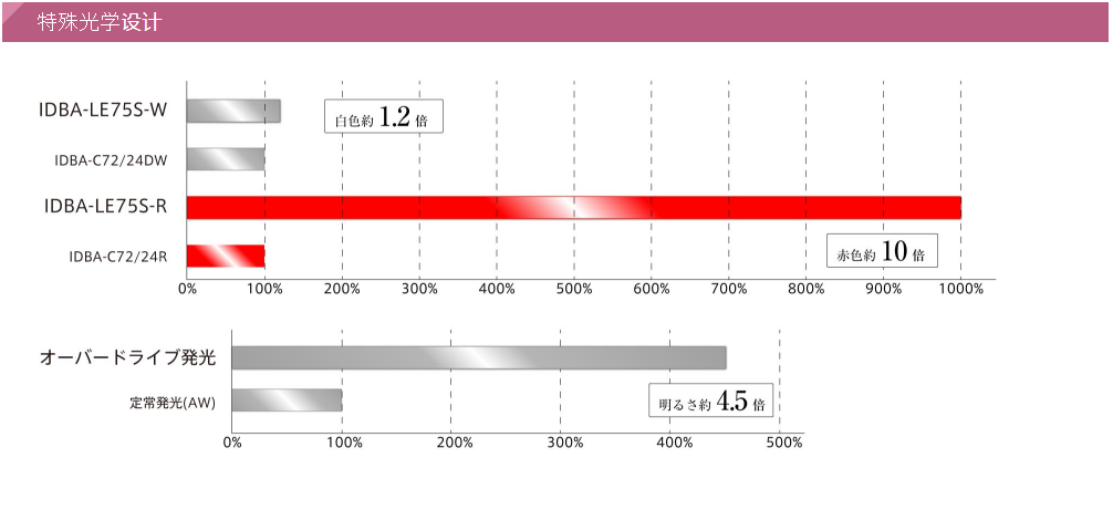 紅色是傳統(tǒng)光的10倍。即使在1500mm以上的遠(yuǎn)距離照射下也能確保高照度。