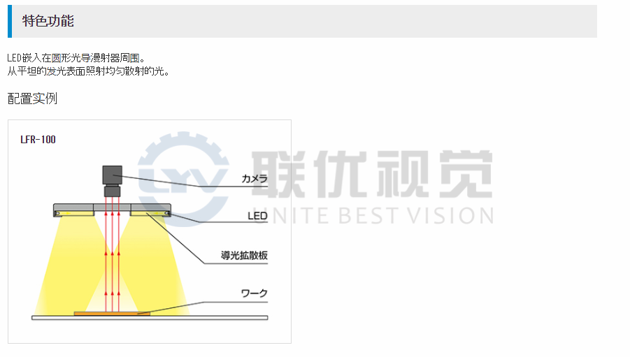 LED嵌入在光導(dǎo)漫射器周圍。從平坦的發(fā)光表面發(fā)出均勻的光。還可以提供從成角度的發(fā)光表面照射的LFR-100K / LFR-130K。