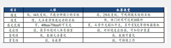 從技術(shù)實(shí)現(xiàn)難度上來(lái)說(shuō),識(shí)別、定位、測(cè)量、檢測(cè)的難度是遞增的,而基于四大基礎(chǔ)功能延伸出的多種細(xì)分功能在實(shí)現(xiàn)難度上也有差異。因此,與人眼直接檢測(cè)相比,機(jī)器視覺(jué)在識(shí)別,定位和測(cè)量方面的優(yōu)勢(shì)較為明顯。隨著深度學(xué)習(xí)和人工智能的發(fā)展,在檢測(cè)方面也逐漸趕上人眼的水平。